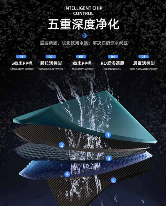 采用PP棉濾芯+顆?;钚蕴繛V芯+精密PP棉濾芯+RO反滲透膜濾芯+后置活性炭濾芯,五重過濾,層層精濾,高效去除自來水中的泥沙、鐵銹、水垢、重金屬、細(xì)菌等等還有物質(zhì),讓師生們喝到的每一滴水都是安全健康的。