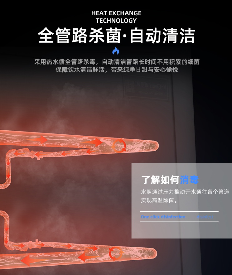 一鍵高溫殺菌,通過壓力推動(dòng)把開水通往各個(gè)管路,實(shí)現(xiàn)高溫殺菌,讓細(xì)菌、病毒無(wú)處藏匿,保障每一滴都是鮮活好水。